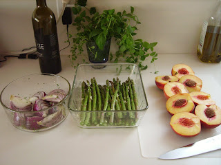 Red Onion tossed with Olive Oil and Savory, Asparagus marinating in Garlic Olive Oil, Yellow Peaches -- a few for grilling and a few to be turned into this!